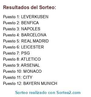 Lista de participantes: ARSENAL, NAPOLES, BARCELONA, ATLETICO, MONACO, LEICESTER, PSG, BENFICA, CITY, BAYERN MUNICH, LEVERKUSEN, REAL MADRID.