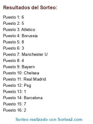 Lista de participantes: Barcelona, Real Madrid, Atletico, Borussia, Bayern, Chelsea, Manchester U, Psg, 1, 2, 3, 4, 5, 6, 7, 8.