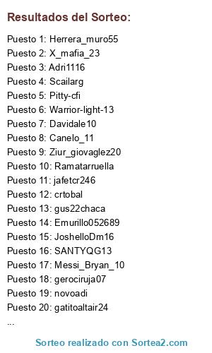 Lista de participantes: gerociruja07, andres_super8, gus22chaca, JoshelloDm16, Davidale10, Ramatarruella, SANTYQG13, Scailarg, bigtino12345, novoadi, fabri_ILCAPO, Heider8912, PackoRM7, Adri1116, crtobal, X_mafia_23, Canelo_11, milo010306, JoseDaniel13, Messi_Bryan_10, Chukie14, kokli_e4, jafetcr246, Jeanstile, Herrera_muro55, ChenchoLove, Emurillo052689, Warrior-light-13, Sauceda, gatitoaltair24, Ziur_giovaglez20, Pitty-cfi.