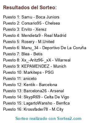 Lista de participantes: Mendieta9 - Real Madrid, Xx_-Aritz96-_xX - Villarreal, Blea - Betis, Rosery - M.United, Markiteps - PSG, SkypR69 - Celta De Vigo, Kentik - Barcelona, Ervito - Xerez, Krossfader78 - M.City, KEPAMENDEZ - Munich, Manu_34 - Deportivo De La Coruña, LagartoWansho - Benfica, Samu - Boca Juniors, Barcelona26 - Arsenal, Corsario95 - Chelsea, aniceto.