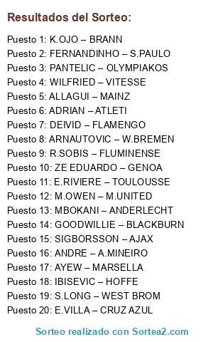 Lista de participantes: ADRIAN – ATLETI, E.VILLA – CRUZ AZUL, MBOKANI – ANDERLECHT, R.SOBIS – FLUMINENSE, FERNANDINHO – S.PAULO, ANDRE – A.MINEIRO, DEIVID – FLAMENGO, AYEW – MARSELLA, M.OWEN – M.UNITED, GOODWILLIE – BLACKBURN, ALLAGUI – MAINZ, ZE EDUARDO – GENOA, PANTELIC – OLYMPIAKOS, K.OJO – BRANN, ARNAUTOVIC – W.BREMEN, SIGBORSSON – AJAX, S.LONG – WEST BROM, WILFRIED – VITESSE, E.RIVIERE – TOULOUSSE, IBISEVIC – HOFFE.