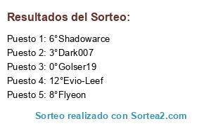 Lista de participantes: 0°Golser19, 3°Dark007, 5°Osky90, 6°Shadowarce, 8°Flyeon, 9°pokeyeg, 11°juanes01, 12°Evio-Leef.