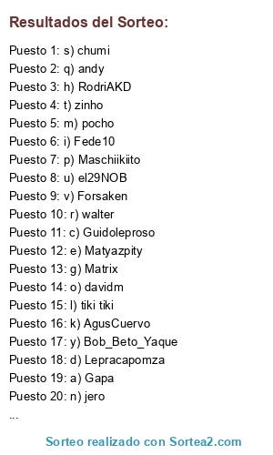 Lista de participantes: a) Gapa, b) Koko, c) Guidoleproso, d) Lepracapomza, e) Matyazpity, f) Minialdosivi, g) Matrix, h) RodriAKD, i) Fede10, j) Danii, k) AgusCuervo, l) tiki tiki, m) pocho, n) jero, o) davidm, p) Maschiikiito, q) andy, r) walter, s) chumi, t) zinho, u) el29NOB, v) Forsaken, x) kkuate, y) Bob_Beto_Yaque.