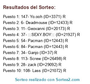 Lista de participantes: 1- GoMmO64 R, 3- Superbkn98 (ID=20614) R, 4- León (ID=25996) R, 6- Deadmouse (ID=12433) R, 8- Seba (ID=20023) R, 11- Geovanni (ID=20173) R, 13- Bewer (ID=17654) R, 25- kicker (ID=21355) R, 27- Freezer (ID=28265) R, 28- zack (ID=29092) R, 34- Ganjo (ID=37) R, 37- :::SEXY.BOY::: (ID=21927) R, 38- mini-diegox (ID=16793) R, 45- Pacman (ID=12443) R, 49- Tobi. (ID=12433) R, 51- Tobi. (ID=12433) R, 52- Pacman (ID=12443) R, 54- Pacman (ID=12443) R, 74- Yo.ooh (ID=3371) R, 75- Pacman (ID=12443) R, 83- Pacman (ID=12443) R, 84- Pacman (ID=12443) R, 90- Pacman (ID=12443) R, 91- Geovanni (ID=20173) R, 94- Lass (ID=21072) R, 95- INK-HEART (ID=24082) R, 105- Lukers (ID=15602) R, 106- Lass (ID=21072) R, 108- Lass (ID=21072) R, 110- Boa Hancock (ID=226) R, 111- Pacman (ID=12443) R, 113- Screw (ID=26498) R, 114- Pacman (ID=12443) R, 119- Pacman (ID=12443) R, 124- Pacman (ID=12443) R, 141- ismael95 (ID=12139) R, 145- :::SEXY.BOY::: (ID=21927) R, 147- Yo.ooh (ID=3371) R.