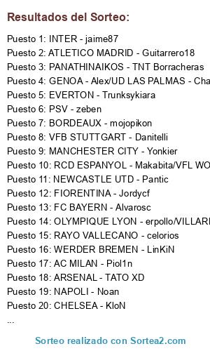 Lista de participantes: PSV - zeben, FC OPORTO - AlexRivas6, BORDEAUX - mojopikon, REAL MADRID CF - raul_flores, GALATASARAY SK - jayser, RCD ESPANYOL - Makabita/VFL WOLFSBURG - IntiPodesta, NAPOLI - Noan, FC SCHALKE 04 - Candelus, SPURS - Droigner, AJAX - sukurpim, EVERTON - Trunksykiara, REAL SOCIEDAD - El mago cule, LIVERPOOL - JulioSR1988, PANATHINAIKOS - TNT Borracheras, RAYO VALLECANO - celorios, ARSENAL - TATO XD, BOR. DORTMUND - Javatocan, VFB STUTTGART - Danitelli, GENOA - Alex/UD LAS PALMAS - ChaChoNazO, WERDER BREMEN - LinKiN, ATHLETIC BILBAO - Escarpa/GETAFE CF - carrique, INTER - jaime87, CHELSEA - KloN, OLYMPIQUE LYON - erpollo/VILLARREAL CF - ELSTIFMAISTER, AC MILAN - Piol1n, MANCHESTER CITY - Yonkier, UDINESE - tulio, FIORENTINA - Jordycf, ATLETICO MADRID - Guitarrero18, FC BAYERN - Alvarosc, NEWCASTLE UTD - Pantic, BOCA JUNIORS - Bunker28.
