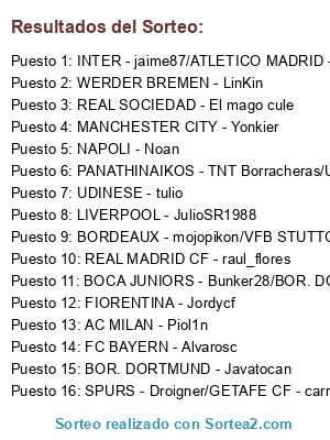 Lista de participantes: NAPOLI - Noan, BOR. DORTMUND - Javatocan, WERDER BREMEN - LinKin, FC BAYERN - Alvarosc, AC MILAN - Piol1n, LIVERPOOL - JulioSR1988, REAL SOCIEDAD - El mago cule, FIORENTINA - Jordycf, MANCHESTER CITY - Yonkier, REAL MADRID CF - raul_flores, UDINESE - tulio, INTER - jaime87/ATLETICO MADRID - Guitarrero18, PANATHINAIKOS - TNT Borracheras/UD LAS PALMAS - ChaChoNazO, BORDEAUX - mojopikon/VFB STUTTGART - Danitelli, BOCA JUNIORS - Bunker28/BOR. DORTMUND - Javatocan, SPURS - Droigner/GETAFE CF - carrique.