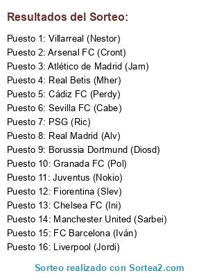 Lista de participantes: Granada FC (Pol), Cádiz FC (Perdy), Manchester United (Sarbei), Liverpool (Jordi), Villarreal (Nestor), PSG (Ric), Real Betis (Mher), FC Barcelona (Iván), Chelsea FC (Ini), Juventus (Nokio), Real Madrid (Alv), Borussia Dortmund (Diosd), Arsenal FC (Cront), Sevilla FC (Cabe), Atlético de Madrid (Jam), Fiorentina (Slev).