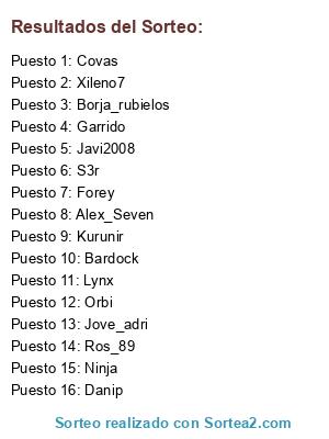 Lista de participantes: Forey, Lynx, Danip, Garrido, Kurunir, Orbi, S3r, Jove_adri, Bardock, Ros_89, Covas, Xileno7, Ninja, Borja_rubielos, Alex_Seven, Javi2008.