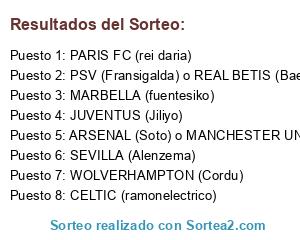 Lista de participantes: MARBELLA (fuentesiko), CELTIC (ramonelectrico), PSV (Fransigalda) o REAL BETIS (Baena), ARSENAL (Soto) o MANCHESTER UNITED (Pescaito), PARIS FC (rei daria), SEVILLA (Alenzema), WOLVERHAMPTON (Cordu), JUVENTUS (Jiliyo).