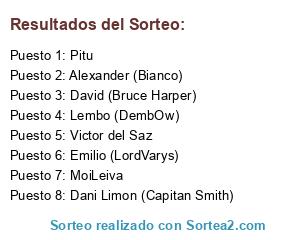 Lista de participantes: Dani Limon (Capitan Smith), David (Bruce Harper), Pitu, Alexander (Bianco), Victor del Saz, Emilio (LordVarys), Lembo (DembOw), MoiLeiva.