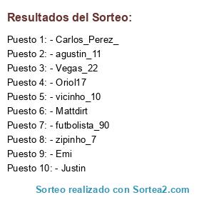 Lista de participantes: - Oriol17, - Vegas_22, - zipinho_7, - vicinho_10, - agustin_11, - futbolista_90, - Emi, - Mattdirt, - Justin, - Carlos_Perez_.