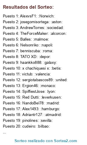 Lista de participantes: Adriantr127: :atmadrid:, adrylito: :malaga:, alead71: :tottenham:, alemalaga94: :bayern:, Alex1493: :hamburgo:, alexfcbarcelona: :dortmund:, AlexvsF1: :Norwich:, AndrewTorres: :sociedad:, Balles: :malmoe:, benniscuba: :roma:, buijin: :celtic:, CometHeaven79: :chelsea:, cudeiro: :bilbao:, DaniBke: New York City, danygp89: :bour:, davidrikoone: :lisboa:, El8Pelocho: :lugo:, Ergion46: :monaco:, ferminnn: :nantes:, Goss83: :schalke:, haankko888: :galaxy:, HaLiToxGCFx: :granada:, Havel7: :psg:, iGosling v9: :arsenal:, iSugar v11: B. Moenchegladbad, Ivanxio: :sounders:, javitr: :city:, josegomisortega: :aston:, KaOs I AsTuR: :oviedo:, lorenbb: :marsella:, Luispro0103: :river:, merayombasogo: :ponfe:, misterserpico: :ham:, Mori1983: :fiore:, MrMohamRam: :liverpool:, n0jan: :cristal:, NandoBel78: :madrid:, Nelsonriko: :napoli:, pececillo1977: :ajax:, perikinho90: :cordoba:, pinolines: :sevilla:, Platero17: :oporto:, Red Dutti: :leverkusen:, Rokitys: :cska:, Saavexbox: :palmas:, Semmenup: :orlando:, sergiord14: Wolfsburgo:, sergiotabascos89: :united:, SpiffiestJose: :lyon:, SrPistolas86: :udinese:, StormFury: :elche:, susa16: :alaves:, tabascos89: :barca:, TATO XD: :depor:, TheForceMaker: :alcorcon:, toni1708: :celta:, trunks: :levante:, ulimoreno: :juve:, victub: :valencia:, Viya88: :rayo:, x chachiquesi x: :betis:, xSAMU: :benfica:, Yelko100: :everton:, zzzz jona zzzz: :boca:.