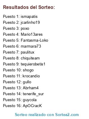 Lista de participantes: marmara73, Abrham4, Fantasma-Loko, tequierobetis1, tenerife_sur, poxo, jcarlinho19, guycola, shogo, paulitux, chiquiteam, ismapatis, krocandio, gullo, Mario13ares, ApOCracK.