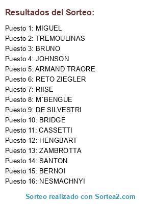 Lista de participantes: TREMOULINAS, JOHNSON, M´BENGUE, HENGBART, DE SILVESTRI, MIGUEL, BRUNO, BERNOI, CASSETTI, NESMACHNYI, ARMAND TRAORE, RIISE, BRIDGE, RETO ZIEGLER, SANTON, ZAMBROTTA.