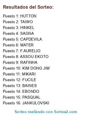 Lista de participantes: FUCILE, PASQUAL, RAFINHA, HINKEL, MATER, HUTTON, MIKARI, CAPDEVILA, F.AURELIO, TAIWO, JANKULOVSKI, BAINES, SAGNA, EBONDO, ASSOU EKOTO, KIM DONG JIM.