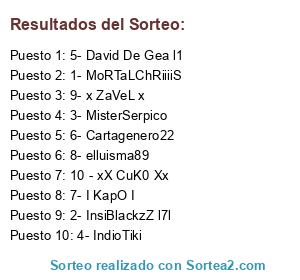 Lista de participantes: 1- MoRTaLChRiiiiS, 2- InsiBlackzZ l7l, 3- MisterSerpico, 4- IndioTiki, 5- David De Gea l1, 6- Cartagenero22, 7- I KapO I, 8- elluisma89, 9- x ZaVeL x, 10 - xX CuK0 Xx.