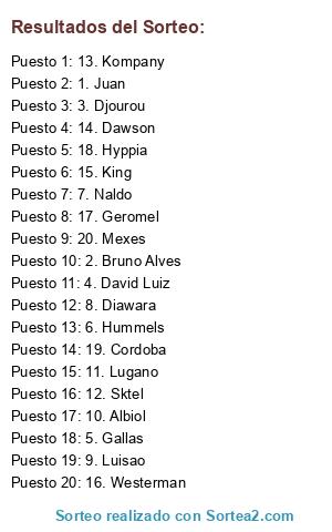 Lista de participantes: 1. Juan, 2. Bruno Alves, 3. Djourou, 4. David Luiz, 5. Gallas, 6. Hummels, 7. Naldo, 8. Diawara, 9. Luisao, 10. Albiol, 11. Lugano, 12. Sktel, 13. Kompany, 14. Dawson, 15. King, 16. Westerman, 17. Geromel, 18. Hyppia, 19. Cordoba, 20. Mexes.