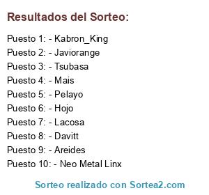 Lista de participantes: - Areides, - Pelayo, - Davitt, - Neo Metal Linx, - Kabron_King, - Lacosa, - Tsubasa, - Mais, - Hojo, - Javiorange.