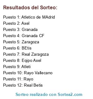 Lista de participantes: BEtis, Rayo, Granada, Zaragoza, Axel, Atleti, Atletico de MAdrid, Eqipo Axel, Real Zaragoza, Granada CF, Rayo Vallecano, Real Betis.