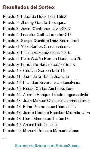 Lista de participantes: Russo Carlos Ariel russitooo, Rami Mosquera Testeo15, Mauro Luciano Iglesias maurolucianoman, Leandro Gothe LeandroCR7, Brandon Silveira brandonsilveira, Elchila Vazquez elchila2015, Javier Contreras Javier2527, Francisco Orellana Galvez francisco-cabj, Eitan Prometheus Raidenkiller, Jhonny García Jhojagaca, Vitor Santos Canuto vitorsfc, Fernando Nadal seba2015-Jrs, Cristian Garzon krilin18, Anibal Roteta Tiefo, Alberto Enrique Toledo Lagos anhykiller, Jaime Rodrigo Escobar Miranda Jaimejames, Eduardo Hdez Edu_Hdez, Juan Manuel Guzzardi Juanmagamer, Juan de la Bahía Juancito, Sergio Quintero Diaz Squinterod, Boris AcUña Pereira Boris_azul25, Rodolfo Henrique rodolfohms, Anibal Mastrantonio anibalpes09, Manuel Reinoso Manuelreinoso.
