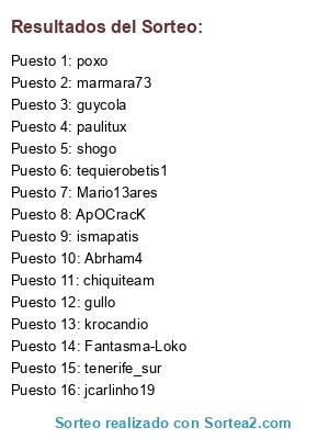 Lista de participantes: 1.-d4v1d_f3nix/R.Betis, 2.-ESMORIS1984/Sevilla FC, 3.-pipo/Barcelona, 4.-sendeta/Real Madrid, 5.-tuti/Manchester city, 6.-bytorres/Roma, 7.-kojho/Marsella, 8.-Nachinishev/At.Madrid, 9.-JAVINHO95STYLE/AC Milan, 10.-adriancar/Manchester UTD, 11.-ZeQuI/Inter Milan, 12.-adrii_pablo/Chelsea, 13.-alicate9/Bayern Munich, 14.-flekis/Napoles, 15.-landergarcia/Juventus, 16.-serer9/Arsenal, 17.-Ikergol/Tottenham, 18.-jonminas2/Liverpool.