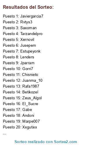 Lista de participantes: Vanmamm, Marpe007, Maza11, Perello, Xernovil, Chisnieto, Rvtys3, Andoni, Xxgutixx, Javiergarcia7, Juanma_10, Zenitramm, Luscoefusco, Tarzandelpro, Exon_Toga, Zeus_Algol, Lionheart, Sergioherasmartin, Siboga, Jusepem, Estupeyonk, Seutito, Lenders, Gorri7, Davies19951995, El_Sucre, A69tepongo, Esancho, Jparram, Gabe, Betikozel, Franmeister, Galesberdurin, Rafa1987, Zanarkanz, Saxoman.
