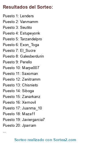 Lista de participantes: Vanmamm, Marpe007, Maza11, Perello, Xernovil, Chisnieto, Rvtys3, Andoni, Xxgutixx, Javiergarcia7, Juanma_10, Zenitramm, Luscoefusco, Tarzandelpro, Exon_Toga, Zeus_Algol, Lionheart, Sergioherasmartin, Siboga, Jusepem, Estupeyonk, Seutito, Lenders, Gorri7, Davies19951995, El_Sucre, A69tepongo, Esancho, Jparram, Gabe, Betikozel, Franmeister, Galesberdurin, Rafa1987, Zanarkanz, Saxoman.