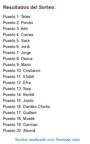 Lista de participantes: Jordi, Mario, German, Josito, Efra, Adri, Correa, Sesi, Kentik, Abundi, V3sti4, Dankko.Chicho, Mustik, Diarce, Sack, Jorge, Guillem, Cristiaron, Ponzio, Teles.