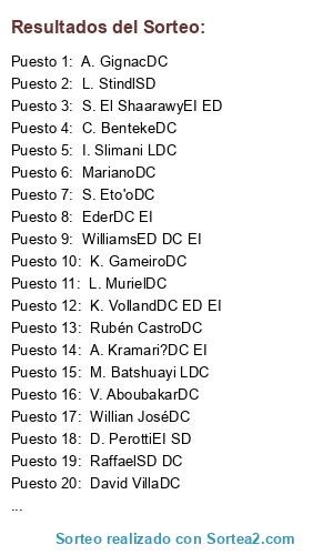 Lista de participantes: LucasED EI, Willian JoséDC, L. StindlSD, O. GiroudDC, K. GameiroDC, David VillaDC, A. Kramari?DC EI, WilliamsED DC EI, J. VardyDC, K. VollandDC ED EI, S. El ShaarawyEI ED, F. SmolovDC, D. PerottiEI SD, D. Sturridge LDC, C. VelaED DC, A. GignacDC, M. GómezDC, RaffaelSD DC, Rubén CastroDC, S. Eto'oDC, MarianoDC, I. Slimani LDC, M. Batshuayi LDC, L. MurielDC, V. AboubakarDC, C. TosunDC, A. KokorinDC ED, L. PrattoDC, C. BentekeDC, S. Joveti?DC, EderDC EI, J. HernándezDC.