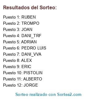 Lista de participantes: Jordi, Mario, German, Josito, Efra, Adri, Correa, Sesi, Kentik, Abundi, V3sti4, Dankko.Chicho, Mustik, Diarce, Sack, Jorge, Guillem, Cristiaron, Ponzio, Teles.