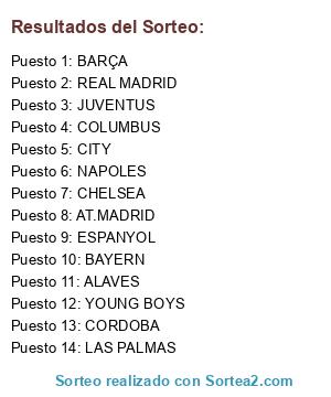 Lista de participantes: AT.MADRID, BAYERN, YOUNG BOYS, CHELSEA, COLUMBUS, CORDOBA, ALAVES, BARÇA, JUVENTUS, CITY, NAPOLES, ESPANYOL, REAL MADRID, LAS PALMAS.