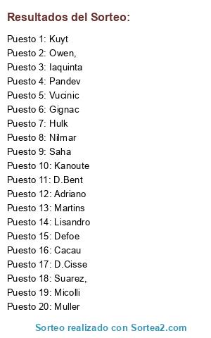 Lista de participantes: Muller, Cacau, Defoe, Saha, Adriano, Kanoute, Vucinic, D.Bent, Nilmar, Owen,, Lisandro, Pandev, Suarez,, Hulk, Micolli, Gignac, Martins, D.Cisse, Iaquinta, Kuyt.