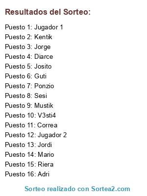 Lista de participantes: V3sti4, Guti, Ponzio, Sesi, Mario, Adri, Kentik, Jordi, Jorge, Riera, Mustik, Jugador 1, Josito, Correa, Diarce, Jugador 2.