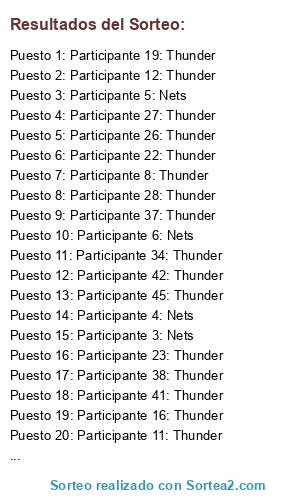 Lista de participantes: Participante 1: Nets, Participante 2: Nets, Participante 3: Nets, Participante 4: Nets, Participante 5: Nets, Participante 6: Nets, Participante 7: Nets, Participante 8: Thunder, Participante 9: Thunder, Participante 10: Thunder, Participante 11: Thunder, Participante 12: Thunder, Participante 13: Thunder, Participante 14: Thunder, Participante 15: Thunder, Participante 16: Thunder, Participante 17: Thunder, Participante 18: Thunder, Participante 19: Thunder, Participante 20: Thunder, Participante 21: Thunder, Participante 22: Thunder, Participante 23: Thunder, Participante 24: Thunder, Participante 25: Thunder, Participante 26: Thunder, Participante 27: Thunder, Participante 28: Thunder, Participante 29: Thunder, Participante 30: Thunder, Participante 31: Thunder, Participante 32: Thunder, Participante 33: Thunder, Participante 34: Thunder, Participante 35: Thunder, Participante 36: Thunder, Participante 37: Thunder, Participante 38: Thunder, Participante 39: Thunder, Participante 40: Thunder, Participante 41: Thunder, Participante 42: Thunder, Participante 43: Thunder, Participante 44: Thunder, Participante 45: Thunder, Participante 46: Thunder, Participante 47: Thunder.