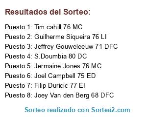 Lista de participantes: Kristoffer Nordfeldt 72 POR, Brian Vandenbussche 69 POR, Pelé Van Anholt 69 LD, Souleymane Bamba 72 DFC, Balanta 74 DFC, Jeffrey Gouweleeuw 71 DFC, Chris Kum 68 DFC, Joey Van den Berg 68 DFC, Guilherme Siqueira 76 LI, Arnold Kruiswijk 69 DFC, Emmanuel Igiebor (Nosa) 76 MC, Tim cahill 76 MC, Jermaine Jones 76 MC, Sven Kums 69 MC, Marten de Roon 669 MC, Georginio Wijnaldum 77 MCO, Filip Duricic 77 EI, J.Janstscher 73 EI, S.Doumbia 80 DC, Joel Campbell 75 ED, Marco Pappa 68 EI.