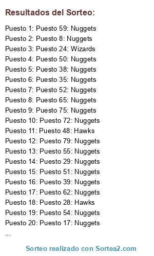 Lista de participantes: Puesto 1: Nuggets, Puesto 2: Nuggets, Puesto 3: Hawks, Puesto 4: Nuggets, Puesto 5: Hawks, Puesto 6: Nuggets, Puesto 7: Nuggets, Puesto 8: Nuggets, Puesto 9: Hawks, Puesto 10: Nuggets, Puesto 11: Nuggets, Puesto 12: Nuggets, Puesto 13: Nuggets, Puesto 14: Nuggets, Puesto 15: Nuggets, Puesto 16: Hawks, Puesto 17: Nuggets, Puesto 18: Nuggets, Puesto 19: Nuggets, Puesto 20: Nuggets, Puesto 21: Hawks, Puesto 22: Wizards, Puesto 23: Nuggets, Puesto 24: Wizards, Puesto 25: Nuggets, Puesto 26: Nuggets, Puesto 27: Nuggets, Puesto 28: Hawks, Puesto 29: Nuggets, Puesto 30: Nuggets, Puesto 31: Nuggets, Puesto 32: Nuggets, Puesto 33: Nuggets, Puesto 34: Nuggets, Puesto 35: Nuggets, Puesto 36: Nuggets, Puesto 37: Hawks, Puesto 38: Nuggets, Puesto 39: Nuggets, Puesto 40: Nuggets, Puesto 41: Nuggets, Puesto 42: Nuggets, Puesto 43: Nuggets, Puesto 44: Nuggets, Puesto 45: Nuggets, Puesto 46: Nuggets, Puesto 47: Nuggets, Puesto 48: Hawks, Puesto 49: Hawks, Puesto 50: Nuggets, Puesto 51: Nuggets, Puesto 52: Nuggets, Puesto 53: Nuggets, Puesto 54: Nuggets, Puesto 55: Nuggets, Puesto 56: Nuggets, Puesto 57: Nuggets, Puesto 58: Wizards, Puesto 59: Nuggets, Puesto 60: Wizards, Puesto 61: Nuggets, Puesto 62: Nuggets, Puesto 63: Nuggets, Puesto 64: Wizards, Puesto 65: Nuggets, Puesto 66: Hawks, Puesto 67: Wizards, Puesto 68: Nuggets, Puesto 69: Hawks, Puesto 70: Wizards, Puesto 71: Nuggets, Puesto 72: Nuggets, Puesto 73: Nuggets, Puesto 74: Wizards, Puesto 75: Nuggets, Puesto 76: Nuggets, Puesto 77: Nuggets, Puesto 78: Nuggets, Puesto 79: Nuggets, Puesto 80: Nuggets, Puesto 81: Nuggets.
