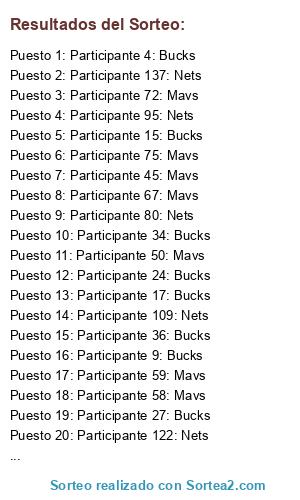 Lista de participantes: Participante 1: Bucks, Participante 2: Bucks, Participante 3: Bucks, Participante 4: Bucks, Participante 5: Bucks, Participante 6: Bucks, Participante 7: Bucks, Participante 8: Bucks, Participante 9: Bucks, Participante 10: Bucks, Participante 11: Bucks, Participante 12: Bucks, Participante 13: Bucks, Participante 14: Bucks, Participante 15: Bucks, Participante 16: Bucks, Participante 17: Bucks, Participante 18: Bucks, Participante 19: Bucks, Participante 20: Bucks, Participante 21: Bucks, Participante 22: Bucks, Participante 23: Bucks, Participante 24: Bucks, Participante 25: Bucks, Participante 26: Bucks, Participante 27: Bucks, Participante 28: Bucks, Participante 29: Bucks, Participante 30: Bucks, Participante 31: Bucks, Participante 32: Bucks, Participante 33: Bucks, Participante 34: Bucks, Participante 35: Bucks, Participante 36: Bucks, Participante 37: Bucks, Participante 38: Bucks, Participante 39: Bucks, Participante 40: Bucks, Participante 41: Bucks, Participante 42: Bucks, Participante 43: Bucks, Participante 44: Bucks, Participante 45: Mavs, Participante 46: Mavs, Participante 47: Mavs, Participante 48: Mavs, Participante 49: Mavs, Participante 50: Mavs, Participante 51: Mavs, Participante 52: Mavs, Participante 53: Mavs, Participante 54: Mavs, Participante 55: Mavs, Participante 56: Mavs, Participante 57: Mavs, Participante 58: Mavs, Participante 59: Mavs, Participante 60: Mavs, Participante 61: Mavs, Participante 62: Mavs, Participante 63: Mavs, Participante 64: Mavs, Participante 65: Mavs, Participante 66: Mavs, Participante 67: Mavs, Participante 68: Mavs, Participante 69: Mavs, Participante 70: Mavs, Participante 71: Mavs, Participante 72: Mavs, Participante 73: Mavs, Participante 74: Mavs, Participante 75: Mavs, Participante 76: Mavs, Participante 77: Nets, Participante 78: Nets, Participante 79: Nets, Participante 80: Nets, Participante 81: Nets, Participante 82: Nets, Participante 83: Nets, Participante 84: Nets, Participante 85: Nets, Participante 86: Nets, Participante 87: Nets, Participante 88: Nets, Participante 89: Nets, Participante 90: Nets, Participante 91: Nets, Participante 92: Nets, Participante 93: Nets, Participante 94: Nets, Participante 95: Nets, Participante 96: Nets, Participante 97: Nets, Participante 98: Nets, Participante 99: Nets, Participante 100: Nets, Participante 101: Nets, Participante 102: Nets, Participante 103: Nets, Participante 104: Nets, Participante 105: Nets, Participante 106: Nets, Participante 107: Nets, Participante 108: Nets, Participante 109: Nets, Participante 110: Nets, Participante 111: Nets, Participante 112: Nets, Participante 113: Nets, Participante 114: Nets, Participante 115: Nets, Participante 116: Nets, Participante 117: Nets, Participante 118: Nets, Participante 119: Nets, Participante 120: Nets, Participante 121: Nets, Participante 122: Nets, Participante 123: Nets, Participante 124: Nets, Participante 125: Nets, Participante 126: Nets, Participante 127: Nets, Participante 128: Nets, Participante 129: Nets, Participante 130: Nets, Participante 131: Nets, Participante 132: Nets, Participante 133: Nets, Participante 134: Nets, Participante 135: Nets, Participante 136: Nets, Participante 137: Nets, Participante 138: Nets, Participante 139: Nets, Participante 140: Nets.