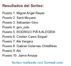 Lista de participantes: Marcos Bueno, sebapitbull, Matias, Gabriel Cisternas ChileBikes, Ale Vergara, aaron, Manuel Anriquez, raimundo, Sherif Rango, Edison Lecaros, Fabian, RODRIGO PIÑA ALEGRIA, Carolina Cuadros Villagra, RS 🇨🇱, pablo, Jesús Bueno, Segundo Sangama, Pancho, Cristian Cares Seguel, Máximo Escárate, sami, Paul Roy, Rodrigo Antonio Castilla, Santi Moyano, Marion Diaz Leon, Juan Guillermo Norero, Nicolas Florez Merlo, Abi, Felipe Corral, Cris, Neniw, MarÃa Ceci Lia, bicampeondeamerica, Carlo Suazo, Paola, Lucas Izcue, Pepo_5, Andres Mauricio Pineda, Lore Hurtado, Valeria Varas, Daniela De La Cerda Naim, Carlos Cesar Hernandez Hernandez, MatÃas V., Alonso Martinn, Jaime Amaya, Heriberto Vallejos Vega, Denisse Casanova, Luis Sepúlveda, Alexis27, dsaez, dsebas, Diego Núñez Bustos, Angelesr, Abraham Rodriguez, gon_zalo, Roberto Flores-Briones, Marcela gaona, Ricardo Basáez, Bicho, amedinamora, Rodrigo Gomez Avalos, Carlos, Sebastian Gino, Francisco Bunster, Miguel Angel Reyes, Gonzalo Rocha.