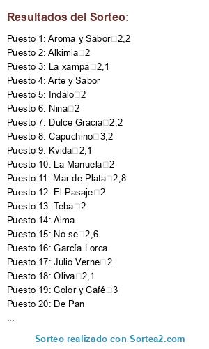 Lista de participantes: Aroma y Sabor 2,2 , Nina 2 , Indalo 2 , Capuchino 3,2 , Julio Verne 2 , Nevot 2 , Oliva 2,1 , Teba 2 , Kvida 2,1 , Mar de Plata 2,8 , Artesanos de Granada 2,2 , Color y Café 3 , No se 2,6 , Ysla 2,2 , Alkimia 2 , Dulce Gracia 2,2 , Castilla 2 , Parraga 21 2,2 , 7 arte 2,6 , Menta y canela 2,5 , Flamingo 2,1 , La Manuela 2 , El Barrio 2 , El Pasaje 2 , La xampa 2,1 , Arte y Sabor , Pikó , De Pan , Gourmande , Alma , García Lorca , .