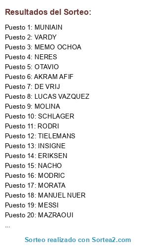 Lista de participantes: MANUEL NUER, MEMO OCHOA, LUCAS VAZQUEZ, MAZRAOUI, DE VRIJ, AKÉ, NACHO, MOLINA, MODRIC, RODRI, TIELEMANS, MUNIAIN, OTAVIO, SCHLAGER, ERIKSEN, NERES, AKRAM AFIF, INSIGNE, MESSI, MORATA, VARDY, JULIAN ALVAREZ.