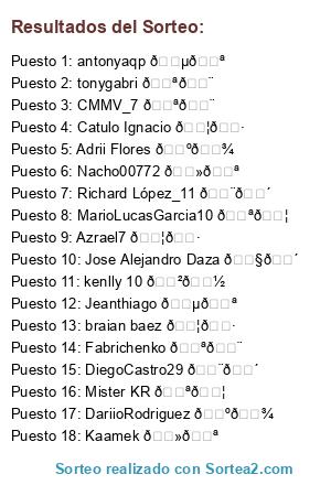 Lista de participantes: Azrael7 🇦🇷, CMMV_7 🇪🇨, DiegoCastro29 🇨🇴, Kaamek 🇻🇪, Mister KR 🇪🇦, Jose Alejandro Daza 🇧🇴, tonygabri 🇪🇨, antonyaqp 🇵🇪, Richard López_11 🇨🇴, Fabrichenko 🇪🇨, kenlly 10 🇲🇽, MarioLucasGarcia10 🇪🇦, Adrii Flores 🇺🇾, braian baez 🇦🇷, Catulo Ignacio 🇦🇷, Jeanthiago 🇵🇪, DariioRodriguez 🇺🇾, Nacho00772 🇻🇪.
