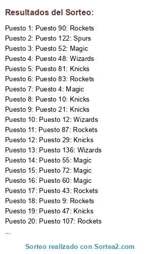 Lista de participantes: Puesto 1: Knicks, Puesto 2: Rockets, Puesto 3: Wizards, Puesto 4: Magic, Puesto 5: Knicks, Puesto 6: Wizards, Puesto 7: Rockets, Puesto 8: Wizards, Puesto 9: Rockets, Puesto 10: Knicks, Puesto 11: Magic, Puesto 12: Wizards, Puesto 13: Rockets, Puesto 14: Magic, Puesto 15: Spurs, Puesto 16: Knicks, Puesto 17: Magic, Puesto 18: Knicks, Puesto 19: Magic, Puesto 20: Spurs, Puesto 21: Knicks, Puesto 22: Magic, Puesto 23: Magic, Puesto 24: Wizards, Puesto 25: Spurs, Puesto 26: Magic, Puesto 27: Rockets, Puesto 28: Knicks, Puesto 29: Knicks, Puesto 30: Spurs, Puesto 31: Rockets, Puesto 32: Knicks, Puesto 33: Rockets, Puesto 34: Spurs, Puesto 35: Knicks, Puesto 36: Magic, Puesto 37: Spurs, Puesto 38: Magic, Puesto 39: Spurs, Puesto 40: Knicks, Puesto 41: Magic, Puesto 42: Rockets, Puesto 43: Rockets, Puesto 44: Wizards, Puesto 45: Magic, Puesto 46: Spurs, Puesto 47: Knicks, Puesto 48: Wizards, Puesto 49: Wizards, Puesto 50: Magic, Puesto 51: Wizards, Puesto 52: Magic, Puesto 53: Knicks, Puesto 54: Wizards, Puesto 55: Magic, Puesto 56: Knicks, Puesto 57: Knicks, Puesto 58: Knicks, Puesto 59: Magic, Puesto 60: Magic, Puesto 61: Spurs, Puesto 62: Knicks, Puesto 63: Spurs, Puesto 64: Wizards, Puesto 65: Knicks, Puesto 66: Magic, Puesto 67: Rockets, Puesto 68: Knicks, Puesto 69: Knicks, Puesto 70: Rockets, Puesto 71: Rockets, Puesto 72: Magic, Puesto 73: Wizards, Puesto 74: Knicks, Puesto 75: Knicks, Puesto 76: Magic, Puesto 77: Knicks, Puesto 78: Magic, Puesto 79: Spurs, Puesto 80: Magic, Puesto 81: Knicks, Puesto 82: Rockets, Puesto 83: Rockets, Puesto 84: Spurs, Puesto 85: Knicks, Puesto 86: Spurs, Puesto 87: Rockets, Puesto 88: Knicks, Puesto 89: Rockets, Puesto 90: Rockets, Puesto 91: Magic, Puesto 92: Knicks, Puesto 93: Spurs, Puesto 94: Magic, Puesto 95: Magic, Puesto 96: Wizards, Puesto 97: Spurs, Puesto 98: Magic, Puesto 99: Rockets, Puesto 100: Spurs, Puesto 101: Rockets, Puesto 102: Knicks, Puesto 103: Spurs, Puesto 104: Spurs, Puesto 105: Spurs, Puesto 106: Wizards, Puesto 107: Rockets, Puesto 108: Knicks, Puesto 109: Magic, Puesto 110: Magic, Puesto 111: Rockets, Puesto 112: Spurs, Puesto 113: Wizards, Puesto 114: Magic, Puesto 115: Magic, Puesto 116: Knicks, Puesto 117: Rockets, Puesto 118: Spurs, Puesto 119: Rockets, Puesto 120: Wizards, Puesto 121: Knicks, Puesto 122: Spurs, Puesto 123: Rockets, Puesto 124: Knicks, Puesto 125: Wizards, Puesto 126: Wizards, Puesto 127: Wizards, Puesto 128: Knicks, Puesto 129: Spurs, Puesto 130: Rockets, Puesto 131: Wizards, Puesto 132: Rockets, Puesto 133: Knicks, Puesto 134: Rockets, Puesto 135: Magic, Puesto 136: Wizards, Puesto 137: Knicks, Puesto 138: Magic, Puesto 139: Magic, Puesto 140: Magic, Puesto 141: Knicks.