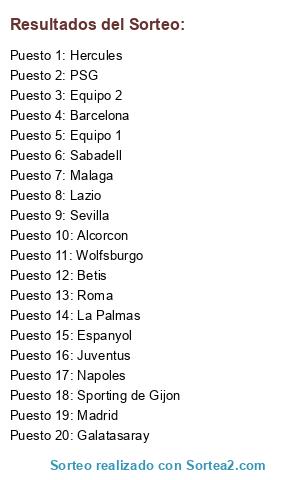 Lista de participantes: Alcorcon, Roma, Sabadell, Barcelona, Galatasaray, Hercules, Juventus, Malaga, Lazio, Betis, Espanyol, Madrid, Sevilla, Napoles, Sporting de Gijon, PSG, Wolfsburgo, La Palmas, Equipo 1, Equipo 2.