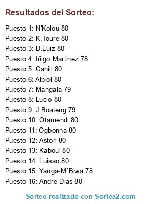 Lista de participantes: Otamendi 80, Luisao 80, Andre Dias 80, D.Luiz 80, Ogbonna 80, K.Toure 80, N'Kolou 80, Lucio 80, Astori 80, Albiol 80, Cahill 80, Kaboul 80, Mangala 79, J.Boateng 79, Yanga-M´Biwa 78, Iñigo Martinez 78.