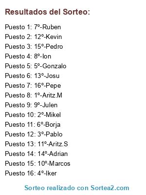 Lista de participantes: 1º-Aritz.M, 2º-Mikel, 3º-Pablo, 4º-Iker, 5º-Gonzalo, 6º-Borja, 7º-Ruben, 8º-Ion, 9º-Julen, 10º-Marcos, 11º-Aritz.S, 12º-Kevin, 13º-Josu, 14º-Adrian, 15º-Pedro, 16º-Pepe.