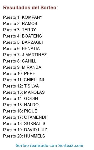 Lista de participantes: T.SILVA, BOATENG, RAMOS, HUMMELS, CHIELLINI, GODIN, PIQUE, KOMPANY, TERRY, OTAMENDI, J.MARTINEZ, BENATIA, NALDO, MIRANDA, BARZAGLI, PEPE, DAVID LUIZ, MANOLAS, SOKRATIS, CAHILL.