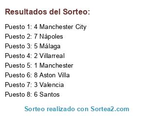 Lista de participantes: 1 Manchester, 2 Villarreal, 3 Valencia, 4 Manchester City, 5 Málaga, 6 Santos, 7 Nápoles, 8 Aston Villa.