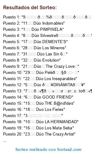 Lista de participantes: *1❇️Dúo PIMPINELA*, *2❇️D͎u͎o͎ L͎o͎s͎ P͎a͎t͎r͎o͎n͎e͎s͎*, *3❇️ꀷꀎꂦ ꀷꏂ ꂦꋪꂦ*, *4❇️Dúo Malaya*, *5❇️Dúo 🔥DINÁMITA🔥*, *6❇️Dúo GOOD FRIEND*, *7❇️🫶🏻ɖนσ ℘εгʄεɕtσ🫶🏻*, *8❇️Dúo Silvestre🕊️🙏🏼🛐*, *9❇️❦︎𝕾𝖔𝖚𝖑𝕸𝖆𝖙𝖊 𝕴𝖓 𝕷𝖚𝖉𝖔❦︎*, *10❇️Dúo LA HERMANDAD*, *11❇️Dúo Indomables*, *12❇️💙 • *~Dᴜ́ᴏ DɪɴᴀᴍɪᴄO~* • ♥️, *13❇️Dúo ALFA Y OMEGA*, *14❇️Duo ŁŌ§ MĀĞØ§ ĐĖĻ ĹÜĎÕ*, *15❇️Dúo TH£ B@nd!døs*, *16❇️Dúo Los Mata Seba*, *17❇️Dúo DEMENTE'S*, *18❇️Duo Los Fieles*, *19❇️Dúo DesTruxTores*, *20❇️Dúo SantConce*, *21❇️Dúo ✰The Crazy Love✰*, *22❇️Dúo Los Inseparables*, *23❇️Dúo The Crazy Artist*, *24❇️Dúo Los Sicarios*, *25❇️Duo Las babys*, *26❇️۞𝔻𝕦𝕠 𝕃𝕒𝕤 𝕃𝕖𝕪𝕖𝕟𝕕𝕒𝕤۞*, *27❇️Dúo Los Cazadores 😎*, *28❇️Dúo Los Mineros*, *29❇️Dúo Pelé🇧🇷 ⚽*, *30❇️Dúo Los invencibles*, *31❇️✜Dúo Las Sin 6✜*, *32❇️Dúo Evolution*.