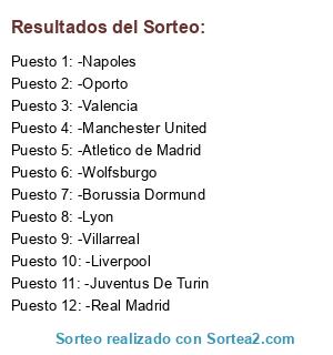 Lista de participantes: -Napoles, -Villarreal, -Valencia, -Wolfsburgo, -Borussia Dormund, -Atletico de Madrid, -Juventus De Turin, -Liverpool, -Manchester United, -Real Madrid, -Oporto, -Lyon.