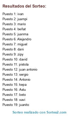 Lista de participantes: Alejandro, Antonio, Astu, beto, beñat, dani, david, juan antonio, juanito, juanma, kepa, mario, miguel, pistola, sergio, xavi, zipy, ivan, juampi.